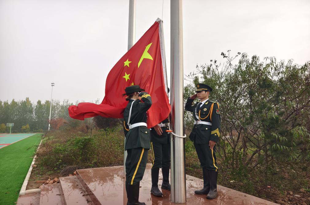 仪式第二项,升国旗、奏国歌。伴随着雄壮的《义勇军进行曲》,鲜艳的五星红旗冉冉升起,迎风飘扬。全体人员肃立,向国旗行注目礼,现场气氛庄严肃穆。