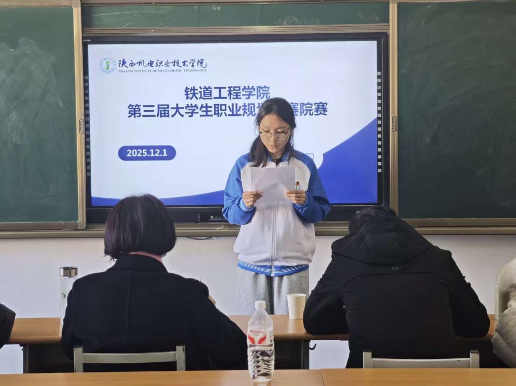 为引导学生树立正确的择业观,明确职业发展方向,提升就业竞争力与职业规划能力。2025年12月1日下午两点,铁道工程学院第三届大学生职业生涯规划大赛院赛在行知楼南212、214教室分组举行。经过前期网评筛选的21名优秀选手参加比赛,展开了一场关于未来职业蓝图的精彩角逐。